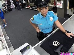 Babe with glasses in a costume high heels and fishnet stockings has sex
